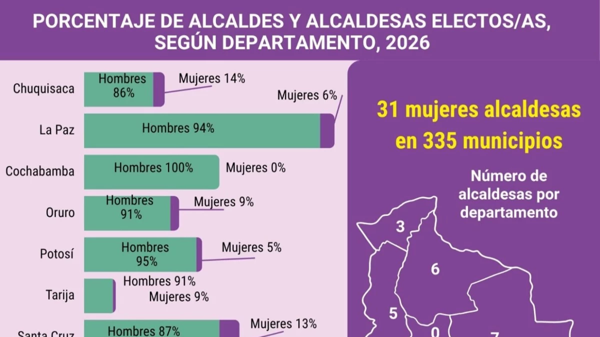 El 9,7 % de las alcaldías en Bolivia, es decir 31 de 335, serán dirigidas por mujeres en el próximo quinquenio, un porcentaje que, si bien es mayor al registrado tras las dos elecciones municipales precedentes, muestra una persistente «brecha de género en el acceso a cargos ejecutivos», advirtió la Coordinadora de la Mujer.